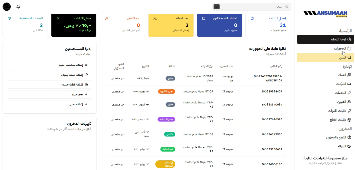افتح أوامر صيانة، عيّن الفنيين، تتبع حالة السيارات، وسجّل قطع الغيار المستخدمة تلقائياً أثناء العمل.